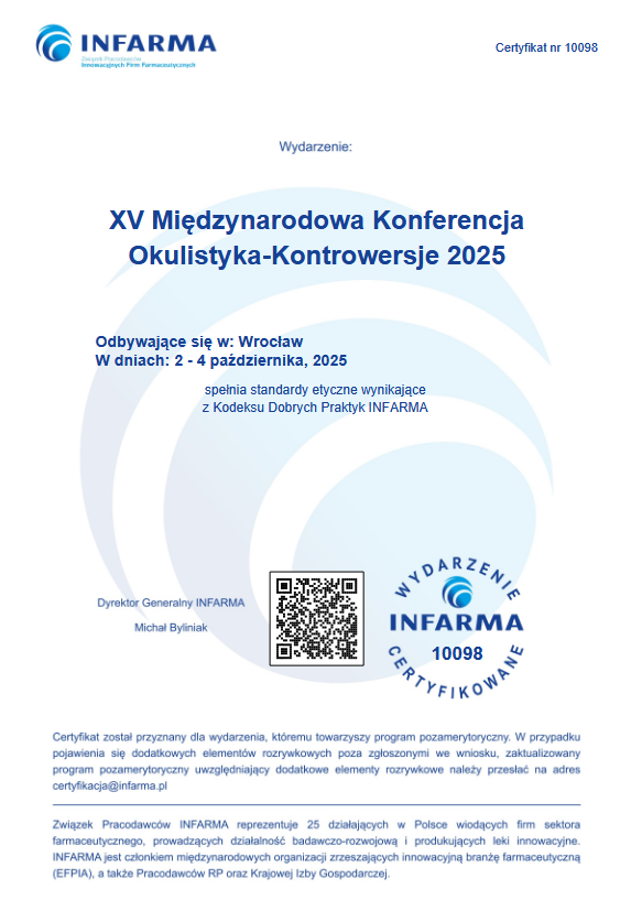 Serdecznie dziękujemy za udział w jubileuszowej, piętnastej edycji Konferencji Okulistyka–Kontrowersje, która odbyła się w dniach 2–4 października 2025 roku we Wrocławiu.